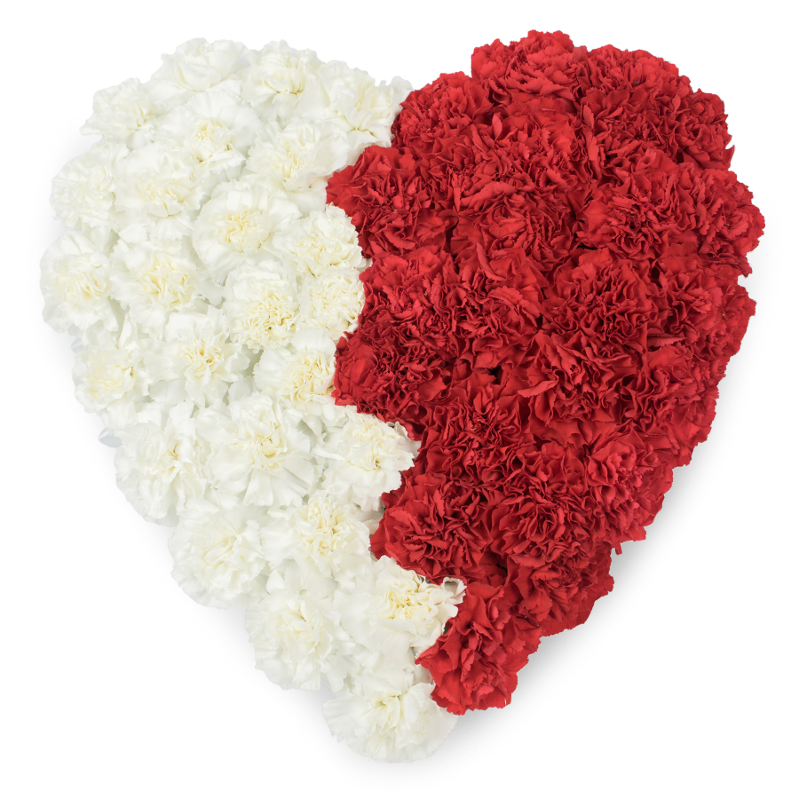 Experience the unparalleled beauty of our heart-shaped bouquet, meticulously crafted by Handy Flowers. This unique arrangement features a vibrant mix of white and red carnations, symbolizing love and sympathy, making it a perfect gift for any occasion.